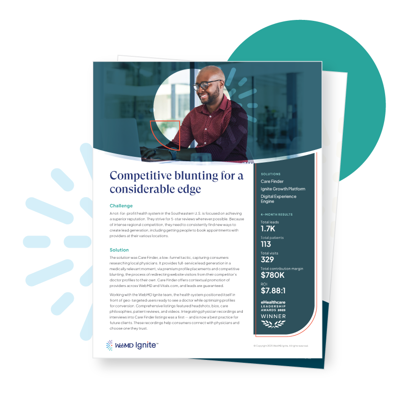 A Southeastern U.S. health system partnered with WebMD Ignite to capture consumers already researching care online. Through contextual promotion of its providers across WebMD and Vitals, combined with premium placements and competitive blunting, the system redirected high-intent consumers to its own physicians at the moment they were ready to choose care.