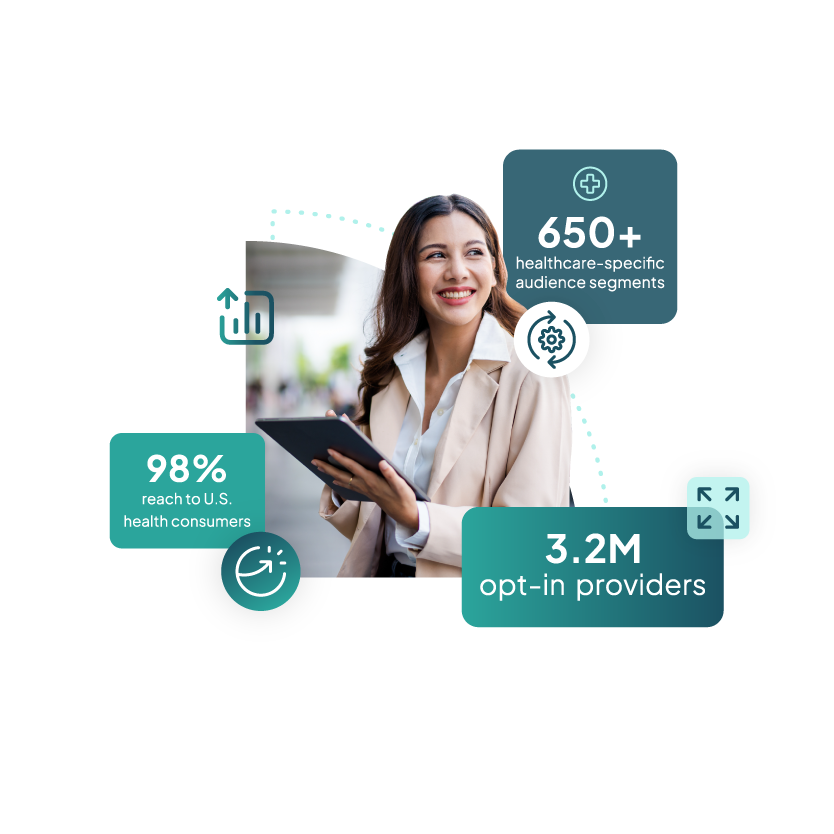Our team blends decades of healthcare experience with hands-on expertise to deliver campaigns that perform. By combining proprietary first-party data, deidentified third-party claims data, predictive modeling, and 650+ healthcare-specific audience segments, we target the right consumers and providers across conditions, behaviors, and specialties. Coupled with seamless access to WebMD, Medscape, and the largest healthcare DSP, your campaigns reach 98% of U.S. health consumers and 3.2 million opt-in providers — making us one of the most trusted healthcare and medical marketing agencies in the industry.