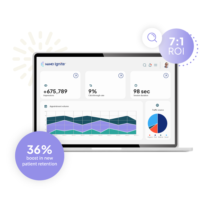 We go beyond reporting — connecting performance directly to growth. Real-time dashboards and integrated engagement platforms show how every interaction turns into conversions, revenue, and retention. Leveraging WebMD’s scale, proprietary data, and predictive modeling, our campaigns deliver precision targeting, fast execution, and proven results — averaging a 7:1 ROI and a 36% boost in new patient retention.